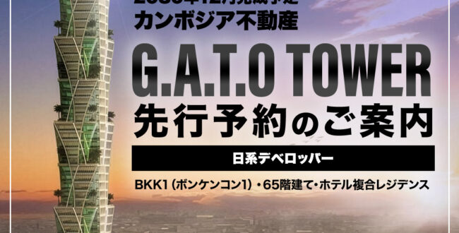 G.A.T.O TOWERの特徴 G.A.T.O TOWER(Global Architect Tower Oasis)は、 カンボジア・プノンペンの中でも最も資産価値が高いとされる BKK1(ボンケンコン … 続きを読む 【日系デベロッパー】G.A.T.O TOWER(Global Architect Tower Oasis)先行予約開始のご案内