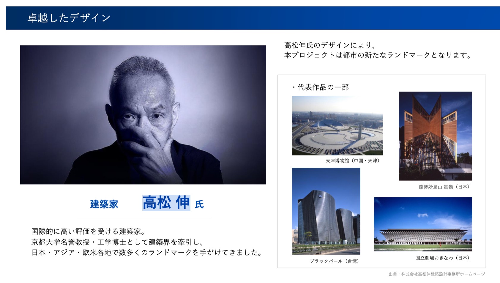 本プロジェクトは、日系デベロッパーによる開発のもと、国際的に高い評価を受ける建築家高松伸氏(京都大学名誉教授・工学博士)がデザインを手がけています。