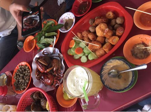 ソーセージやカニカマ、肉団子などの練り物を揚げた物で、チリソースと生野菜(キュウリやニンジン)と共に食べます。