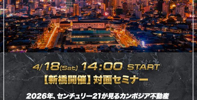 カンボジア不動産を、単なる「新興国投資」ではなく、米ドル建て資産運用という視点から整理して学べる対面セミナーです。カンボジアは高度に米ドル化した経済として知られ、不動産の購入や賃料収入、銀行取引などで米ドルが広く使われて … 続きを読む 4月18日(土)14時【新橋開催】 2026年、センチュリー21が見るカンボジア不動産。米ドル運用・管理・出口まで一気にわかる対面セミナー
