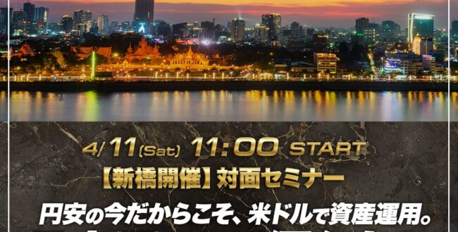 円安やインフレが続く今、資産を日本円だけで持ち続けることに不安を感じている方も多いのではないでしょうか。本セミナーでは、なぜ今「米ドル建て資産」という考え方が注目されているのかを、為替動向や資産分散の基本からわかりやすく … 続きを読む 4月11日(土)11時【新橋開催】円安の今だからこそ、米ドルで資産運用。日本円だけに偏らない守りと分散の考え方 対面セミナー